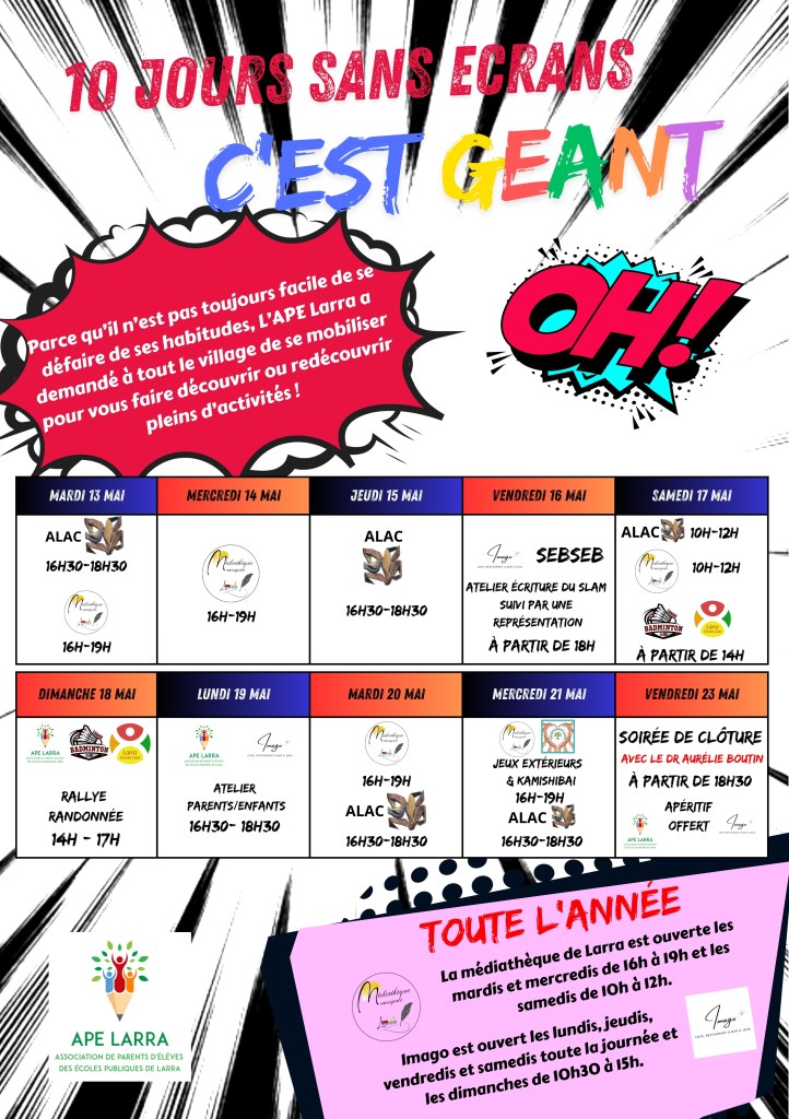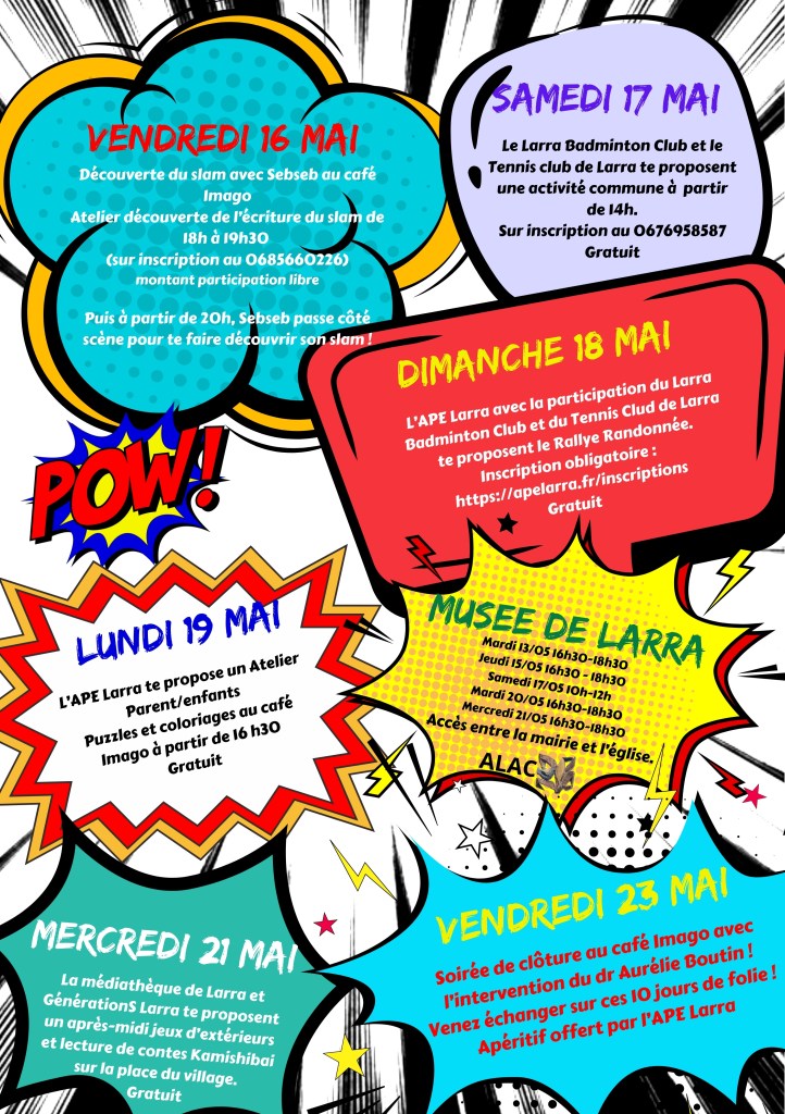 Un grand merci à la Médiathèque municipale de Larra, le Larra Badminton club, le Larra Tennis club, GénérationS Larra, l’Association Larrassienne des Arts et de la Culture (ALAC) et Imago café, restaurant et bar à jeux.