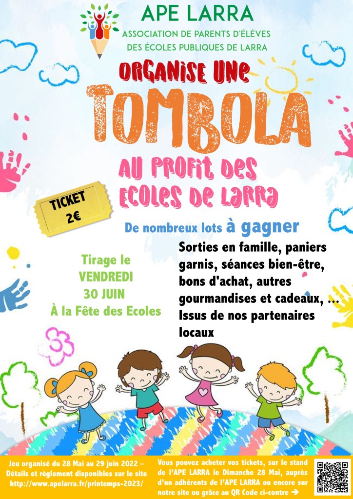 Le tirage au sort aura lieu lors de la Kermesse des écoles du Vendredi 30 Juin à 19h30, dans les écoles de Larra.
