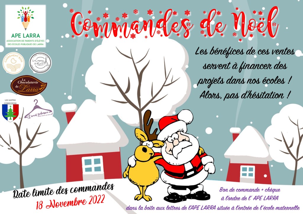 Bon de commande + chèque à l’ordre de l’APE Larra à remettre dans la boîte à lettres de l’APE Larra devant l’école maternelle avant le 18 novembre