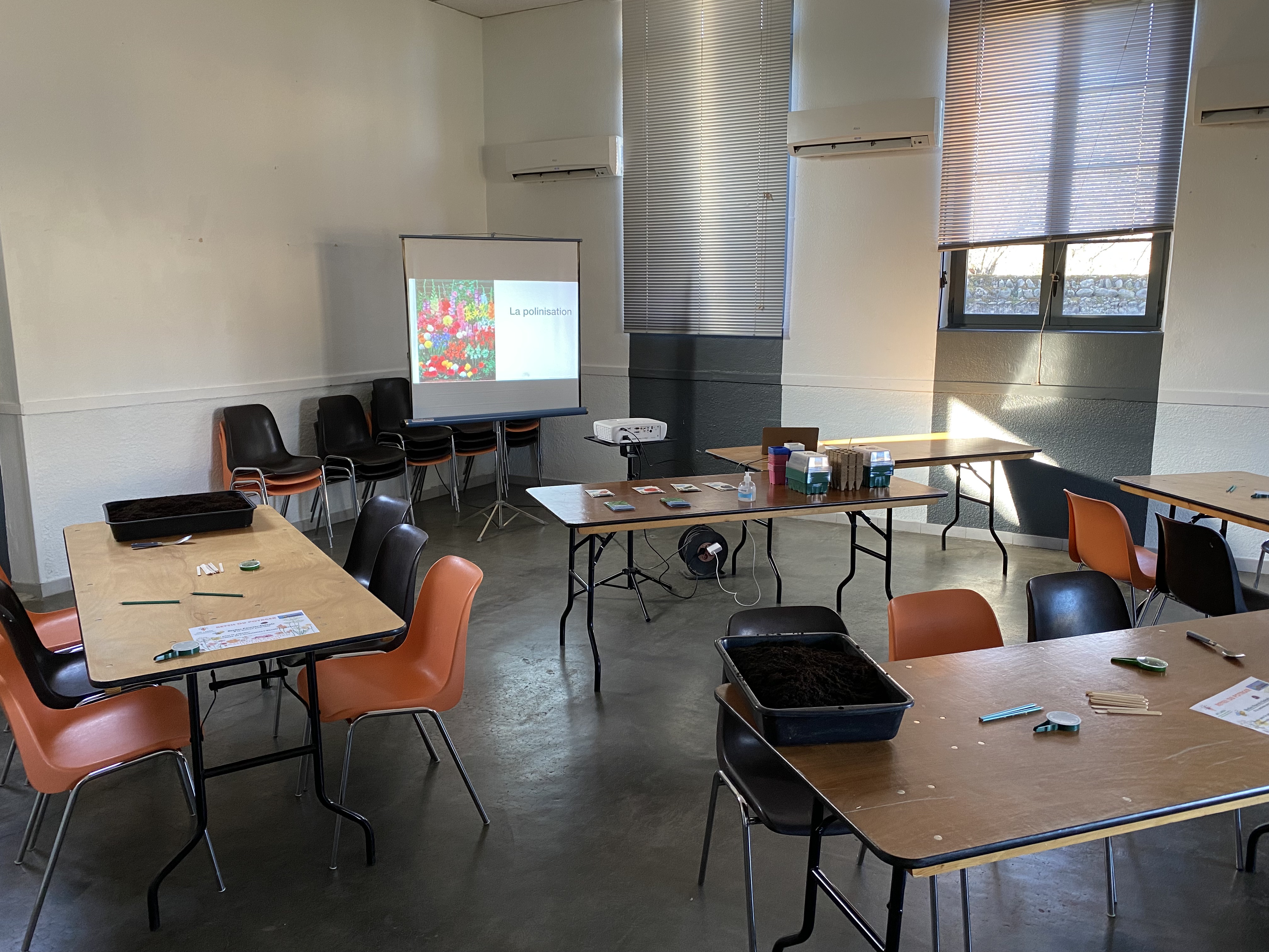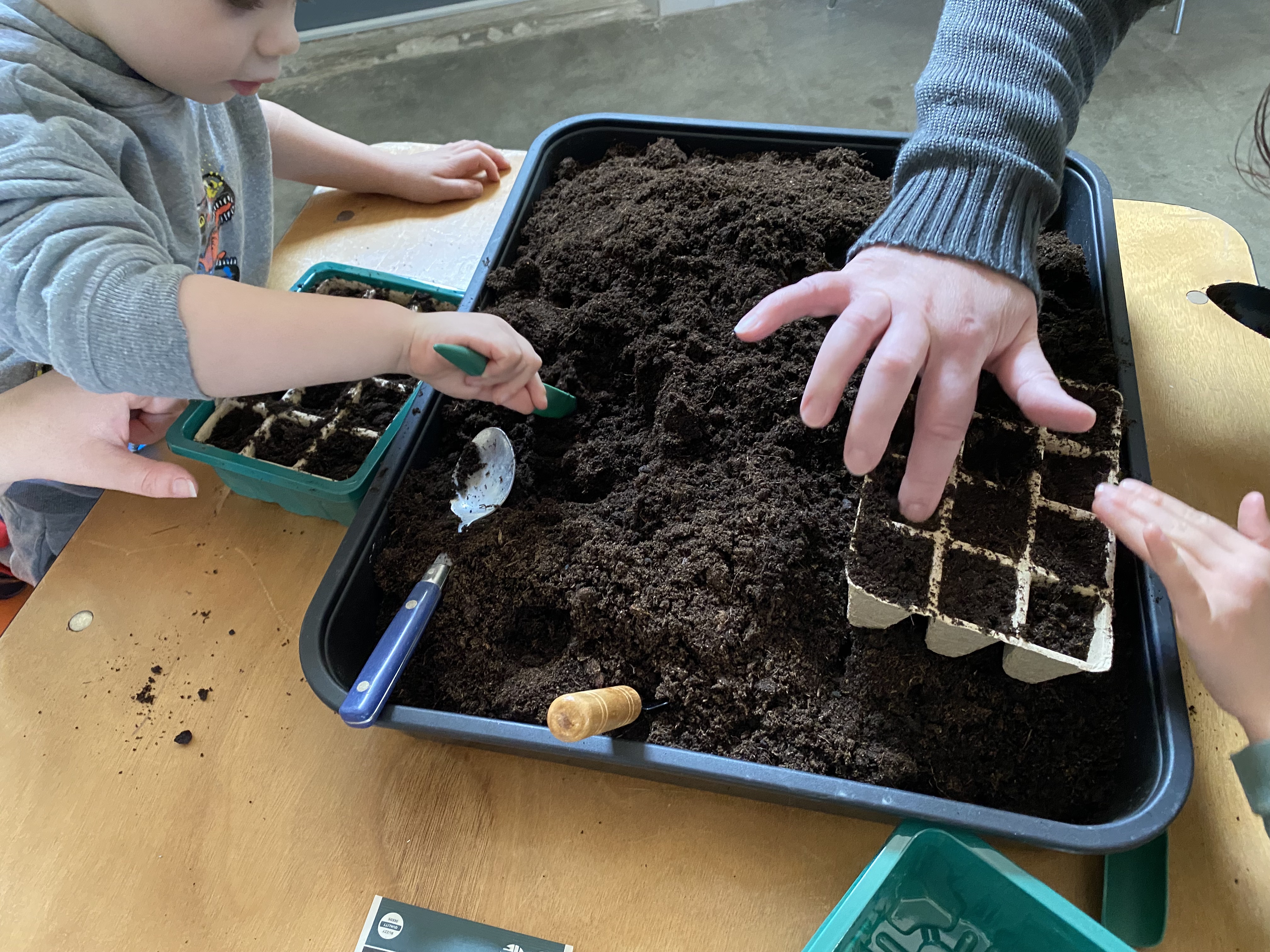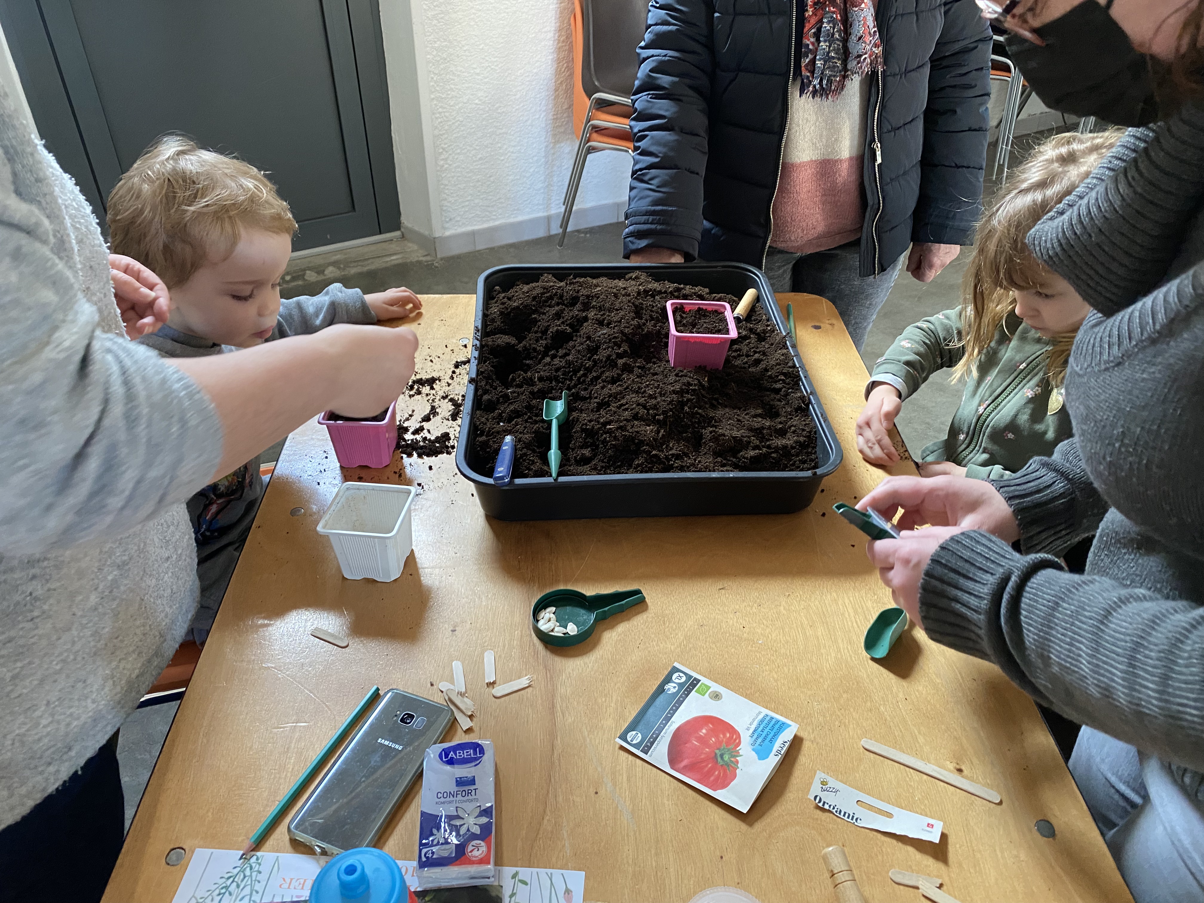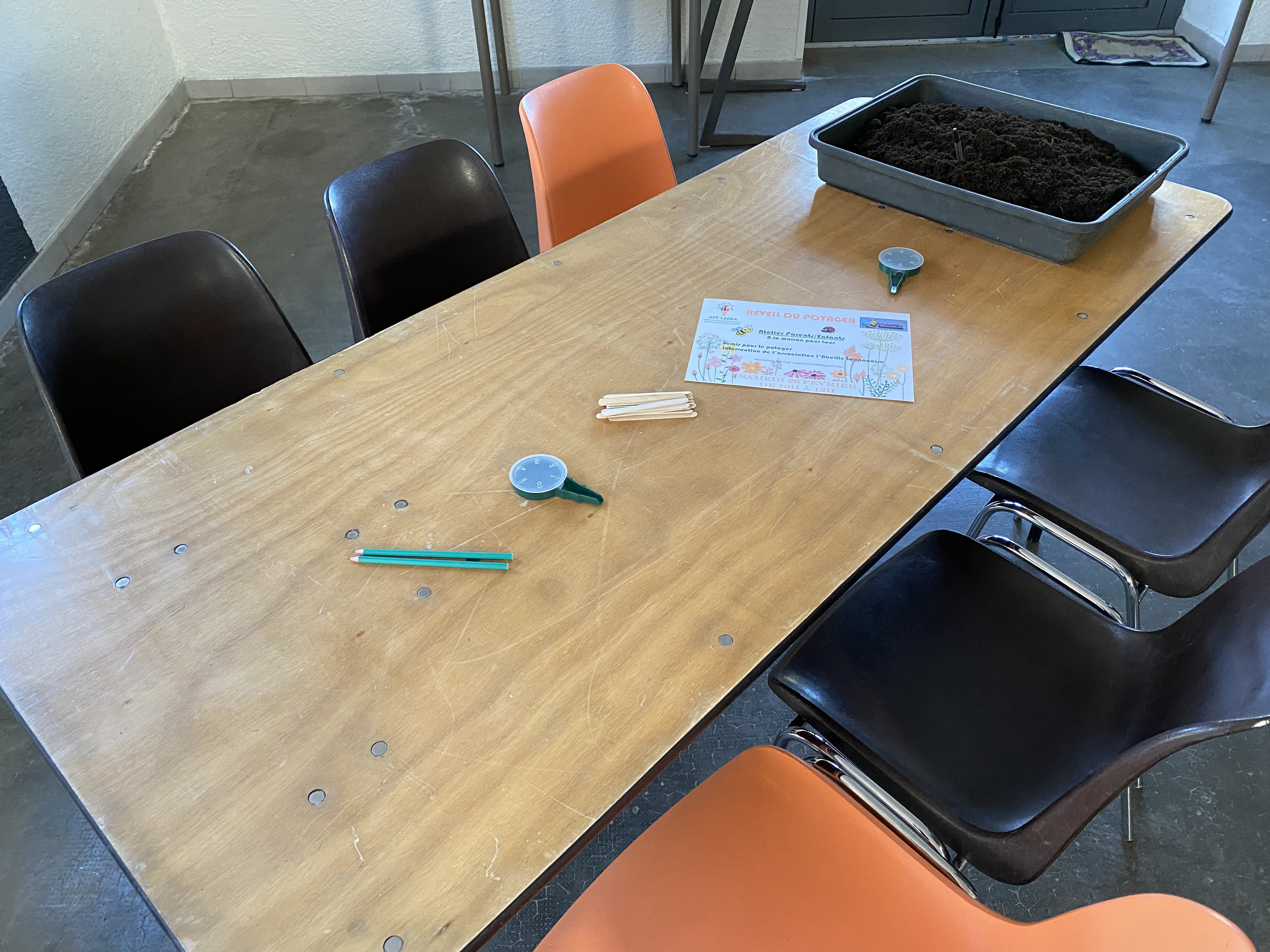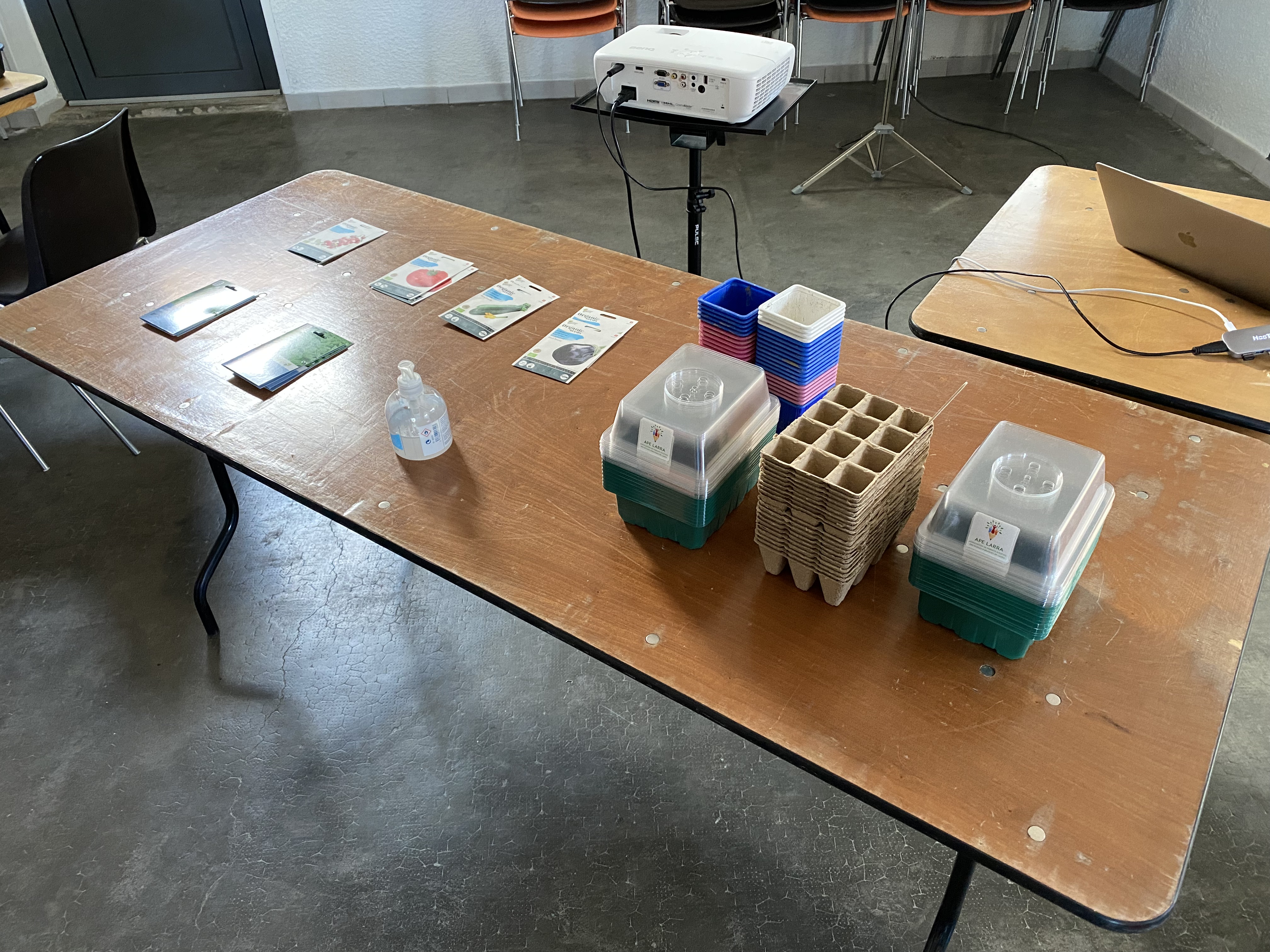 S’en suivra, la réalisation de semis de tomate, tomate cerise, courgette, aubergine et quelques aromates comme le basilic et la menthe avec tout le matériel offert par l’APE LARRA (mini-serre & godets).