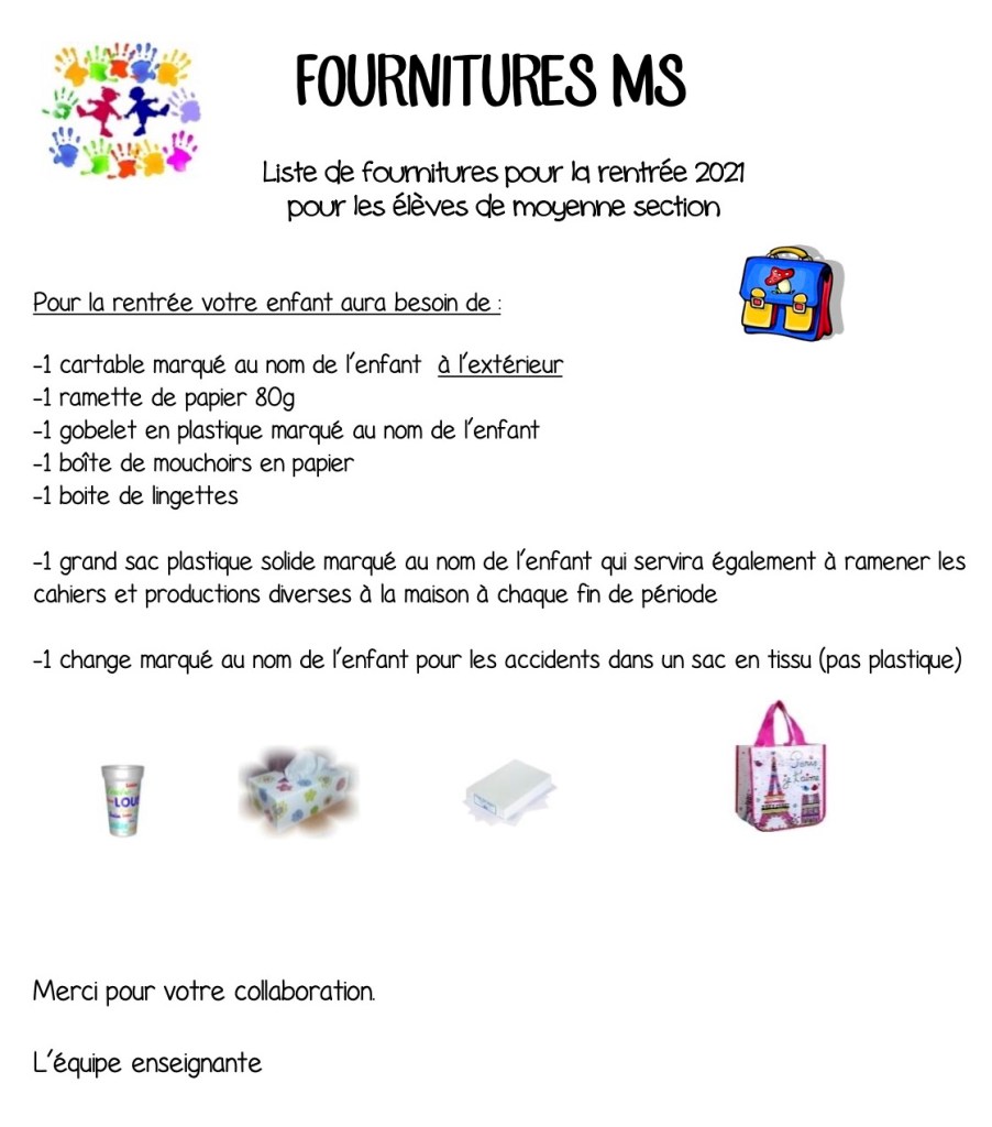 Voici les listes de fournitures pour nos petits écoliers de l’école maternelle: