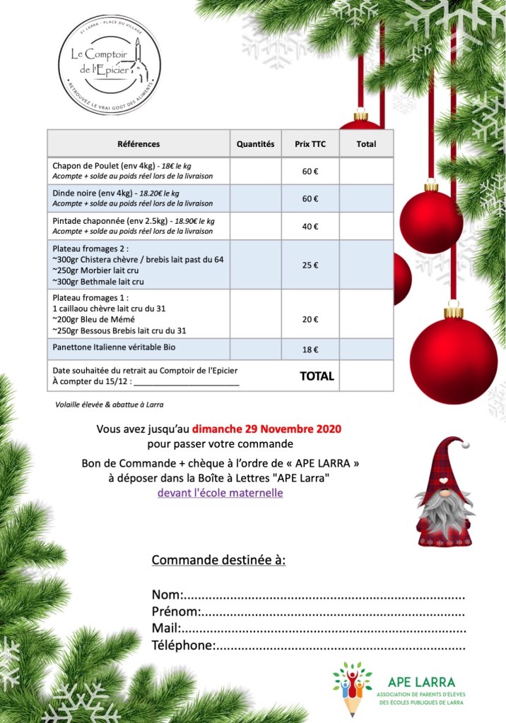 Parce que les fêtes de fin d’année approchent et que ce sont des moments souvent synonymes de gourmandises et festivités, l’APE LARRA a décidé de s’associer avec 4 entreprises locales proches de vous ![]()