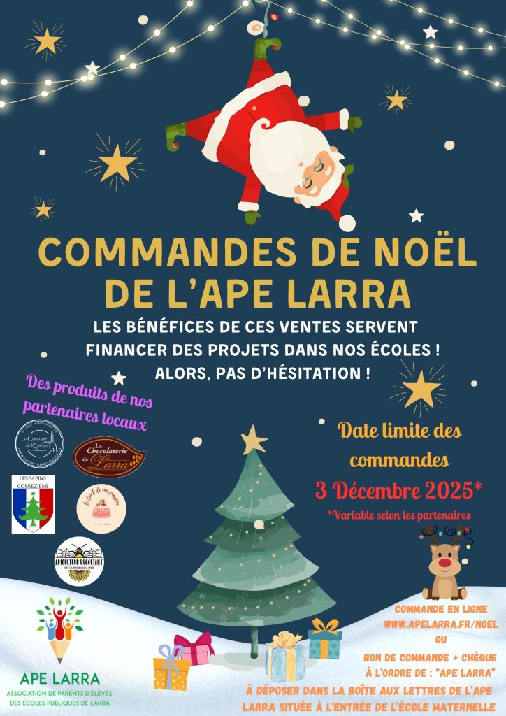 Cette année encore, l’APE Larra souhaite vous faire profiter de tarifs avantageux auprès de commerçants locaux : La Chocolaterie de Larra, Le Comptoir de l’Epicier, l’apiculteur Fabien CHIABO et le Fruit de ma Passion. Vous trouverez aussi des sapins !