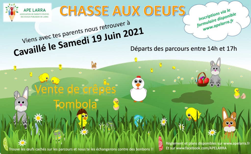 Alors quoi de mieux qu’un jeu de mots « Pas Pâques » pour vous annoncer que comme nous vous l’avions promis, la chasse aux œufs initialement prévue le 18 avril est décalée au samedi 19 juin sur le domaine de Cavaillé 🐣🥚🐥 !!!